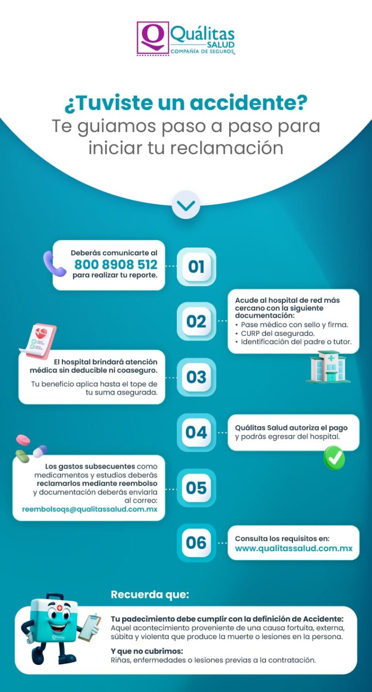 Reporta un accidente directamente a QUALITAS SALUD COMPANIA DE SEGUROS 800-722-5831.